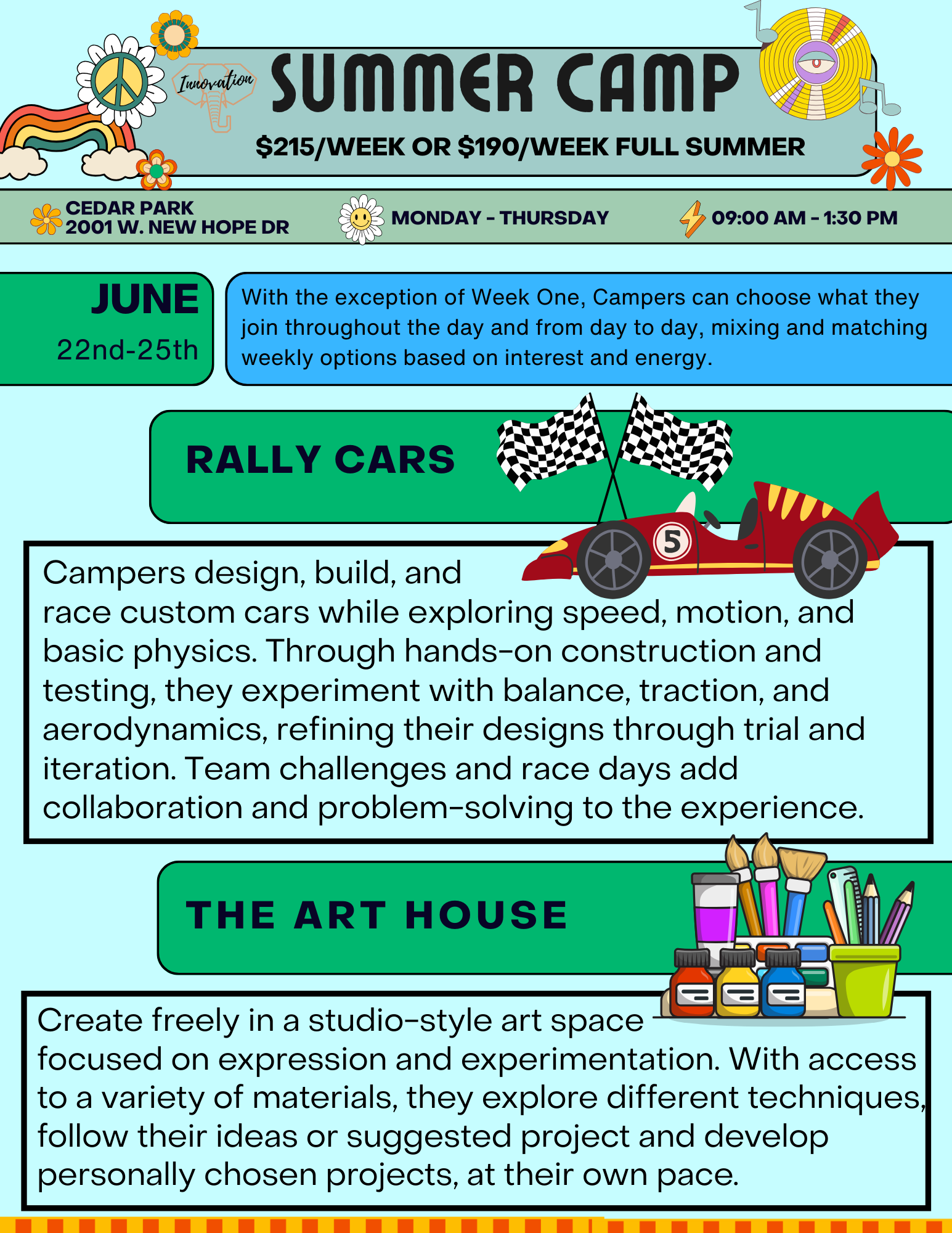 $215 per week or $190 per week for the full summer (week 5 $150 in full summer pricing)